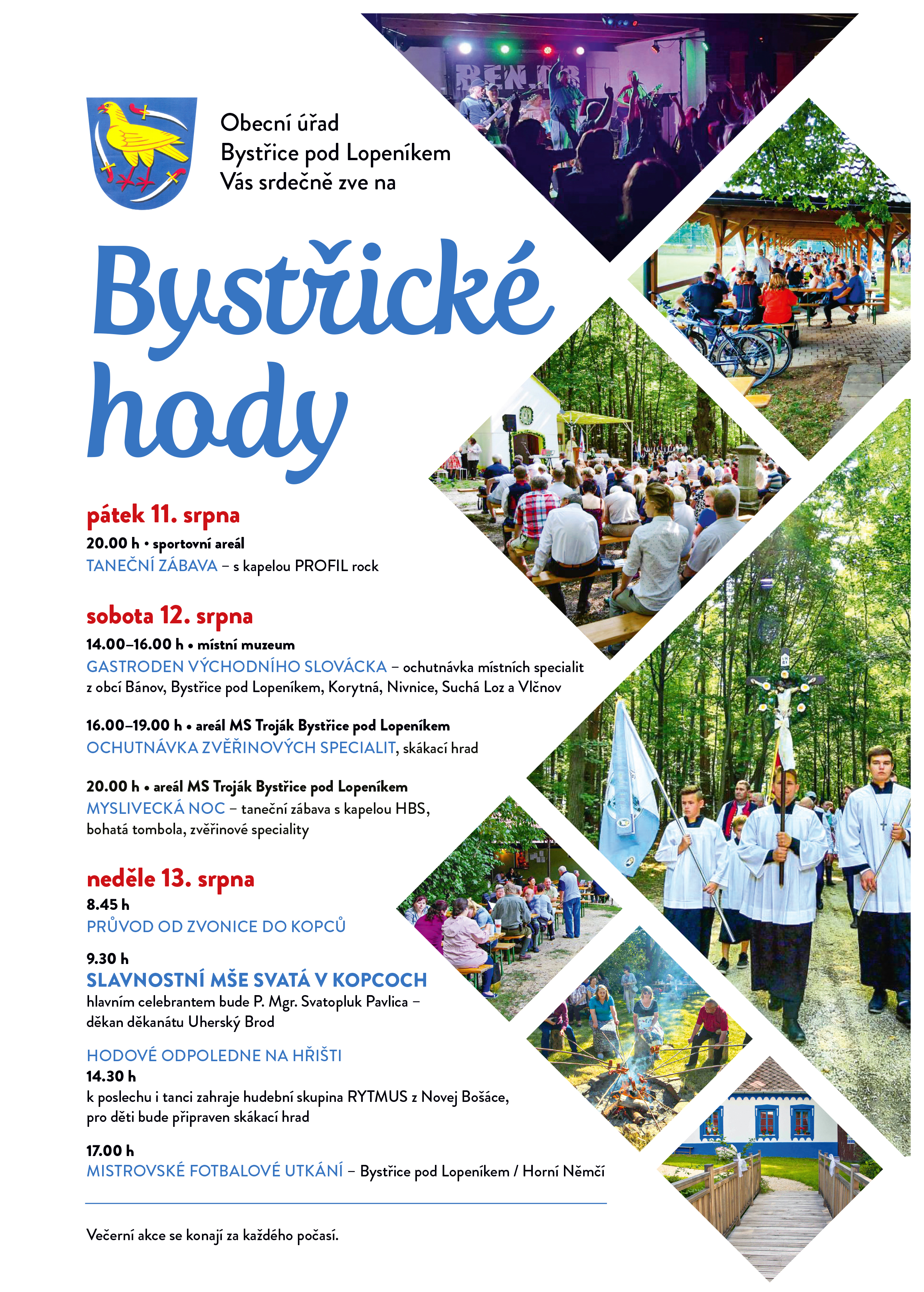 Obecní úřad Bystřice pod Lopeníkem vás srdečně zve na ,,Bystřické hody", které se budou konat ve dnech 11. 8. - 13. 8. 2023.