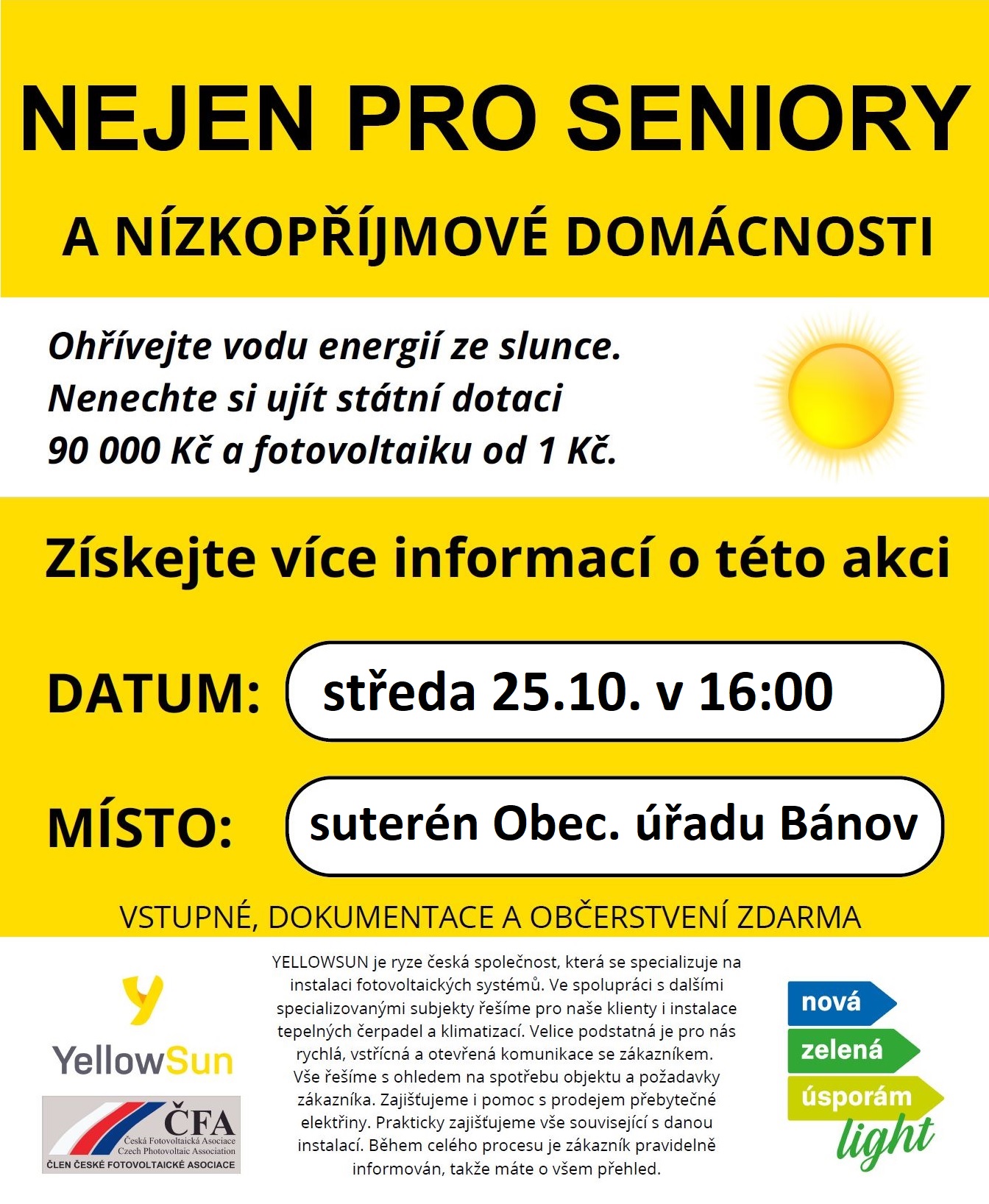 Česká společnost YellowSun pořádá besedu pro seniory a nízkopříjmové domácnosti na téma získání státní dotace ve výši 90 tisíc korun a fotovoltaického systému na ohřev vody.